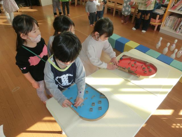 ゲームコーナーでは、ボーリングや輪投げ、スマートボールを真剣な表情で行っていました。