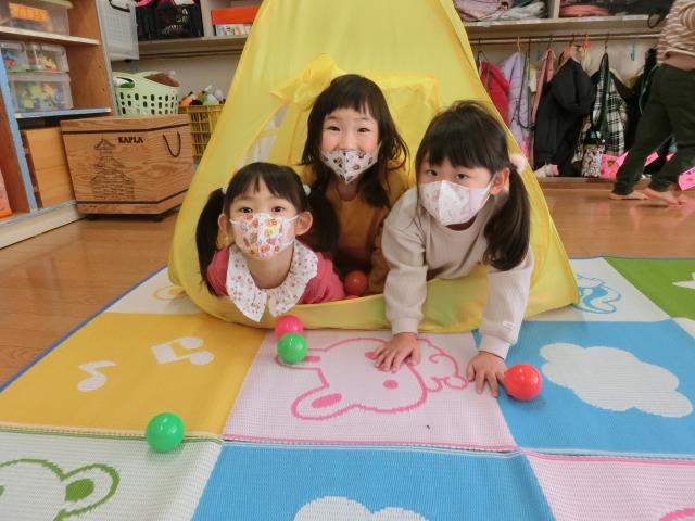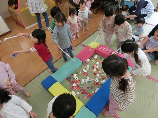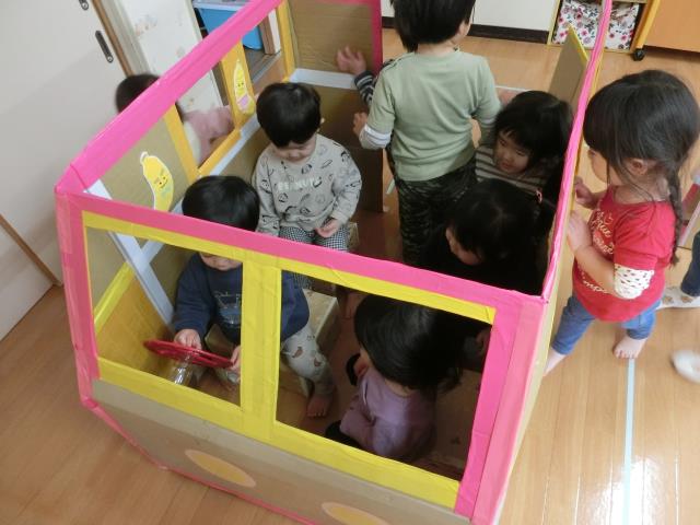 つくしぐみでは、手作りバスに乗ったり、ボールプールや魚釣りをして楽しんでいます。