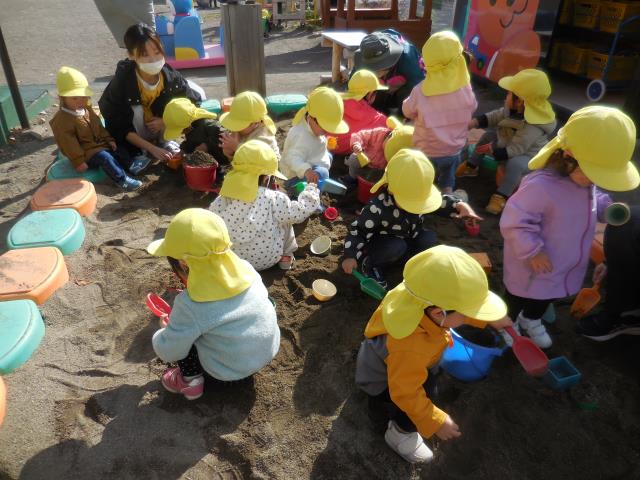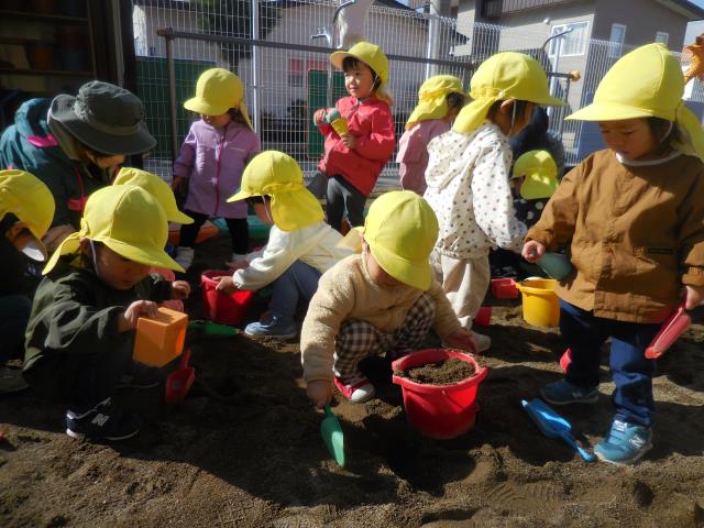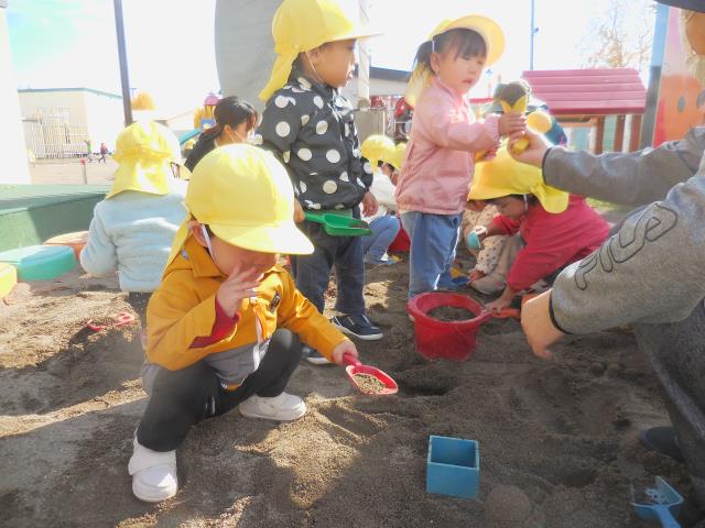 バケツやスコップや型抜きのオモチャ等を使って、それぞれ遊んでいます。