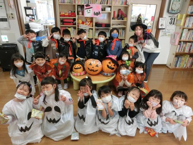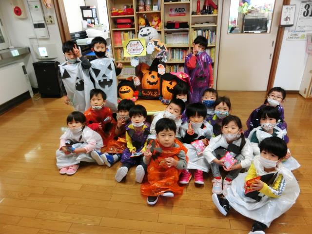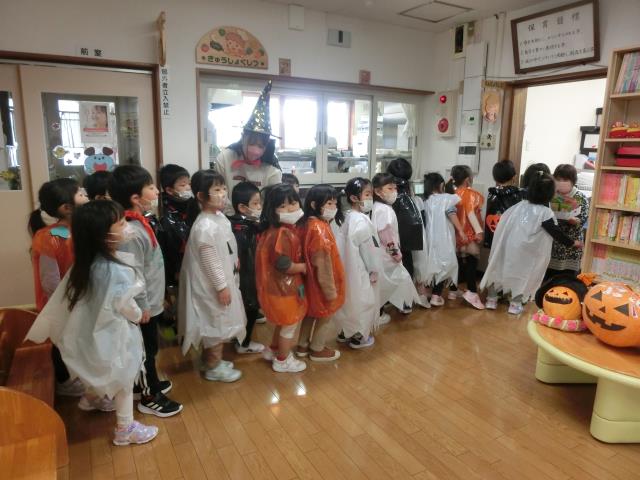 今日はちゅうりっぷ・さくら・すみれぐみのお友だちが楽しみにしていた、『ハロウィン』を行いました。