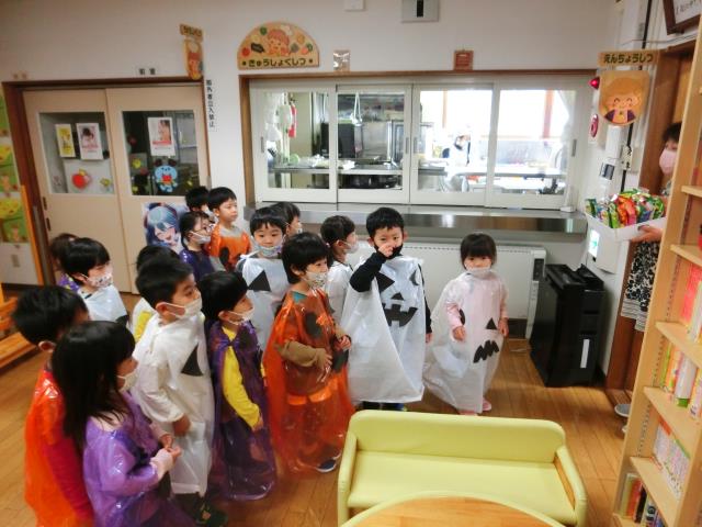 園長先生の所に行き、「トリック オア トリート!」と言ってお菓子をもらうと大喜びの子ども達!!