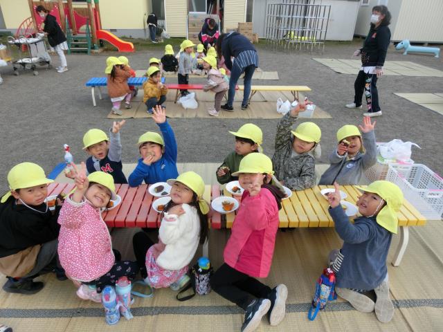 すみれぐみのお兄さんお姉さんと先生達が焼いてくれた『さつまいも・じゃがいも・かぼちゃ』を、皆で美味しく戴きましたよ。