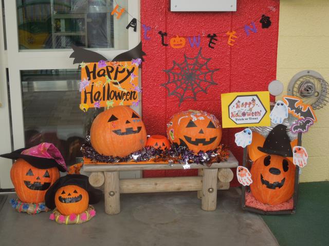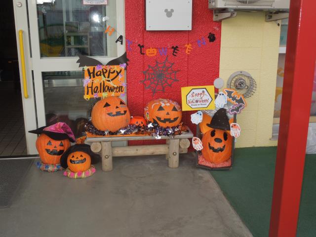 園舎玄関前に、ちゅうりっぷ・さくら・すみれぐみのお友だちが作成した、ハロウィンの飾りが登場♪