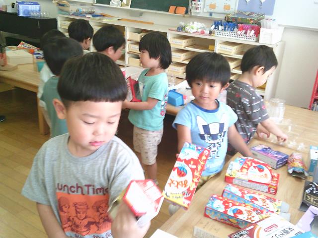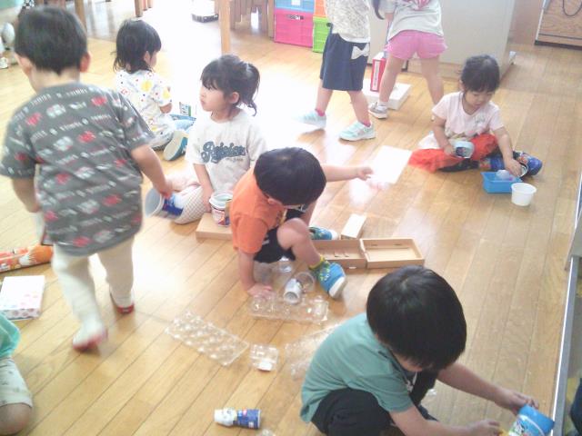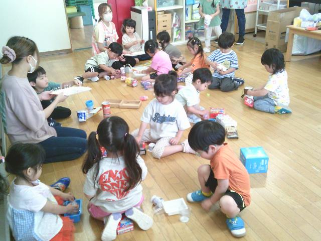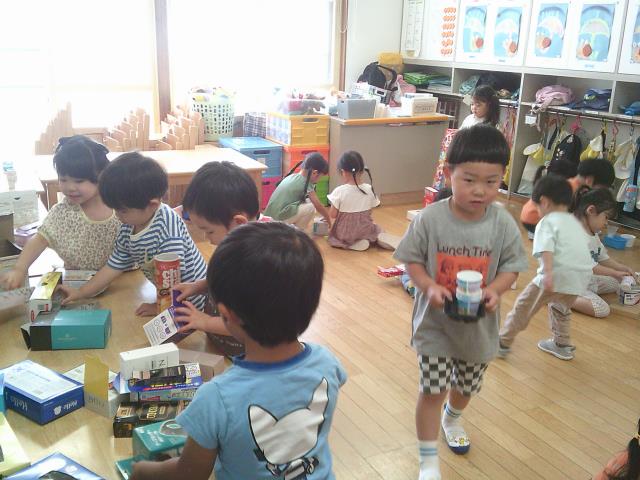 初めての取り組みだったので、最初はただ箱を並べたりするだけでしたが、テープでくっつけてみたりしながら、思い浮かべた物の形を作ってみながら楽しんでいました!!