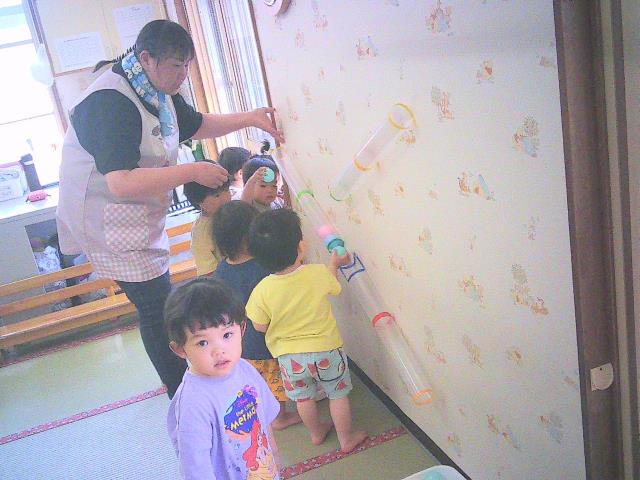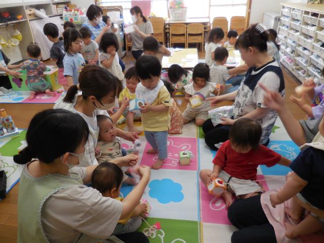 今日は0・1・2歳児が遊びを通して、交流を深める「にこにこタイム」でした。