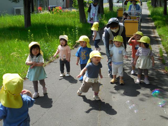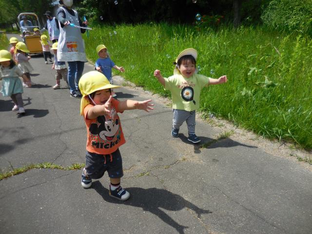 大好きなしゃぼん玉を飛ばすと、大盛り上がりで追いかけていたつくしぐみさんでした。