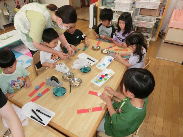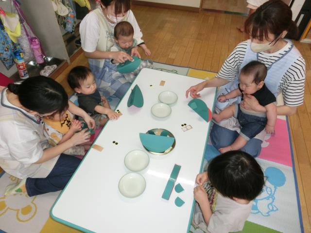 年齢に合わせてシール貼りをしたり、顔を描いたり、セロテープで固定したりしています。