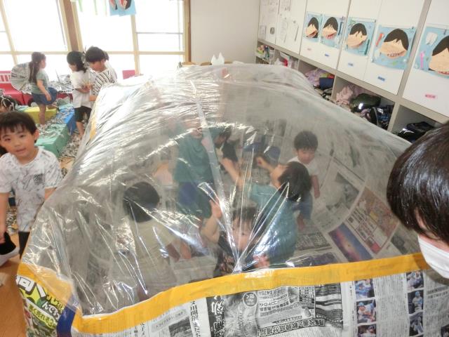 扇風機で中に風を送り、膨らんだドームの中に入って遊びました。