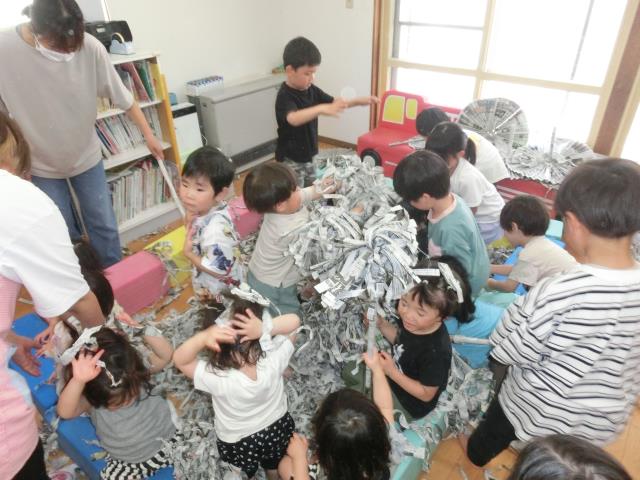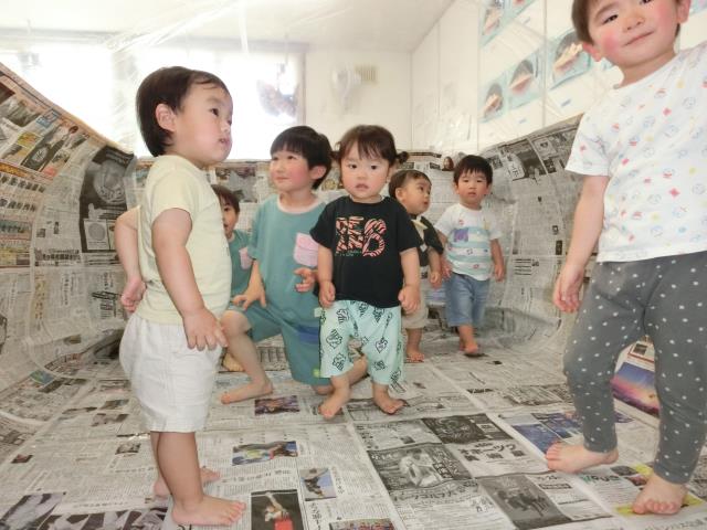 新聞紙プールや新聞紙の積み木を積んで、元気よく遊んでいます。
