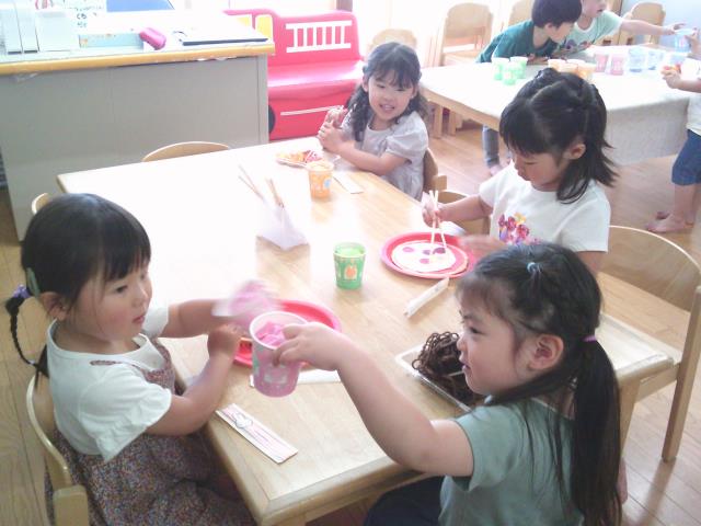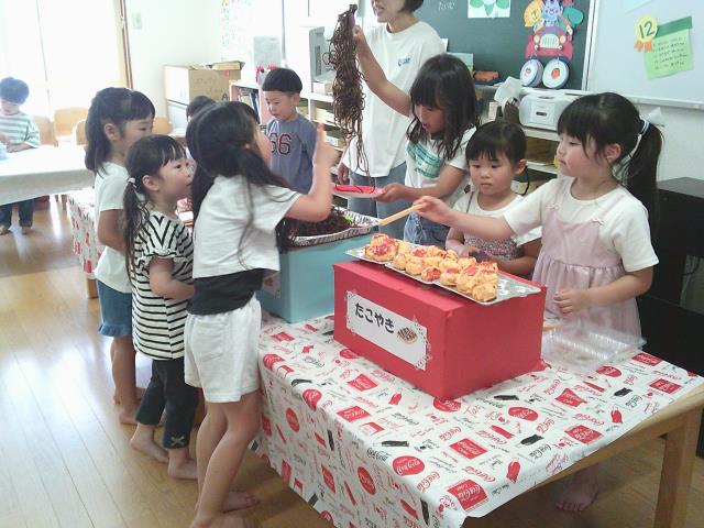 今回は焼きそば・たこやき・ピザ・ジュース屋さんがあり、お店屋さんになったりお客さんになったりして楽しんでいます。