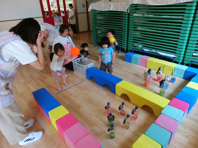 ホールではトランポリンとボーリングや的当てのゲームコーナーがあり、的やピンをねらってボールを投げたり、高くジャンプをして楽しんでいました。