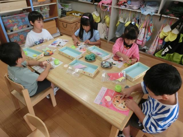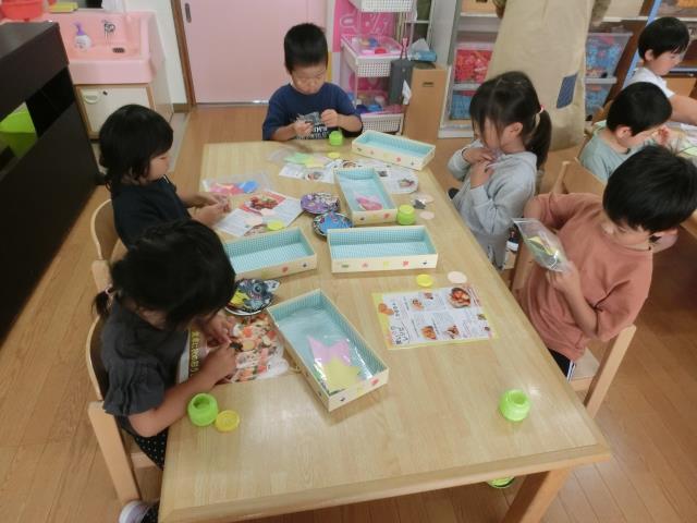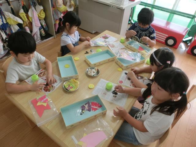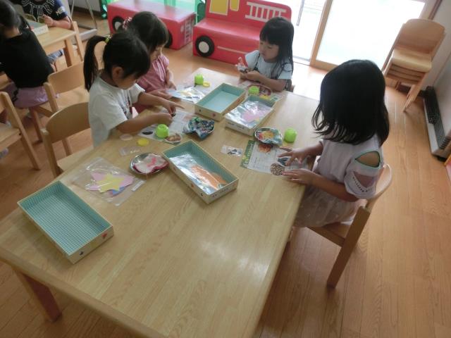 織姫様と彦星様のお顔を描いたり、のりで貼っていき、「次はどうするの~?」「できたよ~!」などと言いながら、積極的に楽しんで製作をしていた子ども達です。