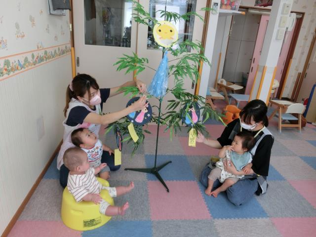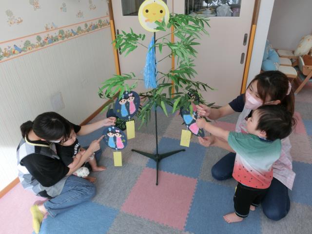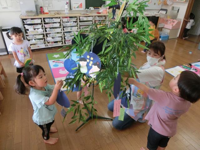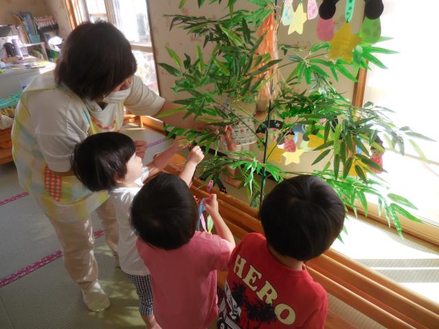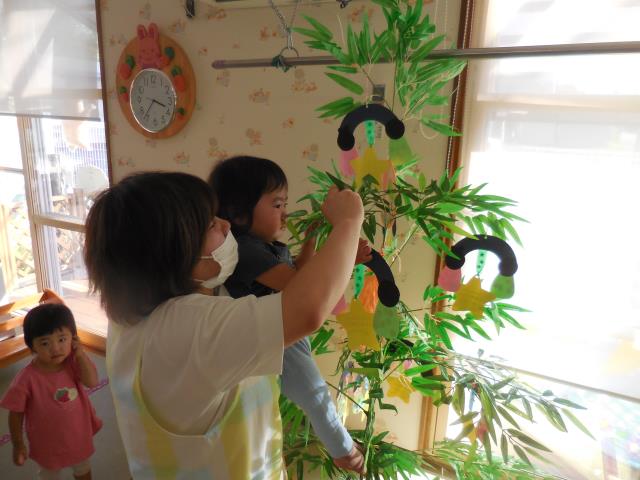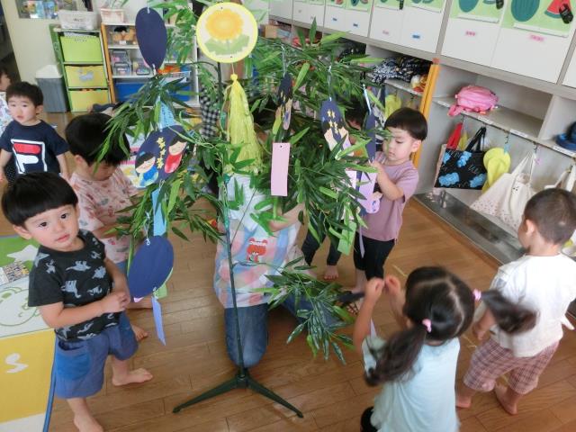 頑張って製作した短冊を嬉しそうに飾る子、真剣にどこに飾ろうか考える子などなど・・様々でした。