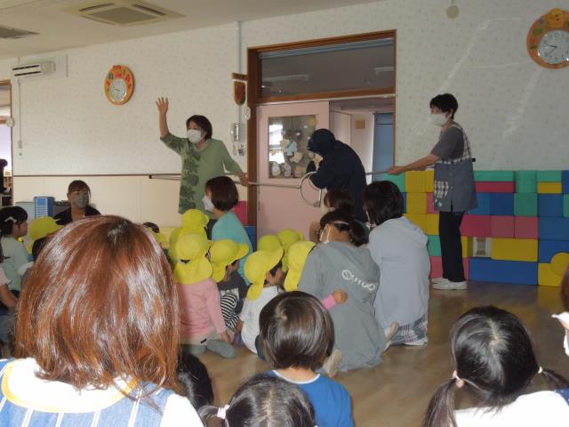 出し物のくいしんぼうのゴリラの手遊び歌に合わせて、ペープサートを見て手を叩いて喜んだり、一緒に歌ったりして集中してみていましたよ。