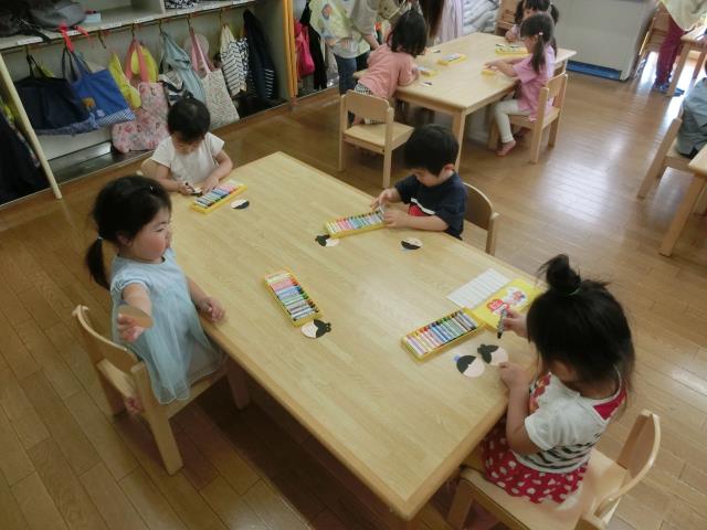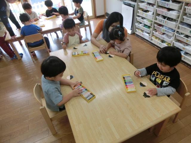 七夕製作では、織姫様・彦星様の顔を描く工程で、クレヨンを使用し、目や口を描きました。