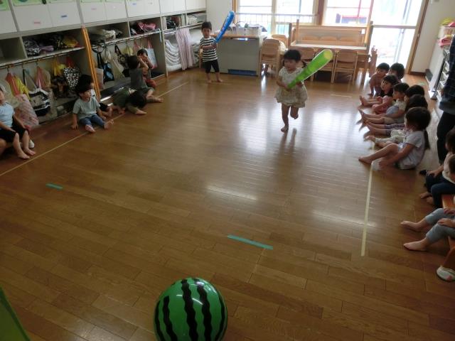 すいか割りでは、すいかの模様のボールとビ二-ルでできたバットを使って楽しんでいた子ども達。