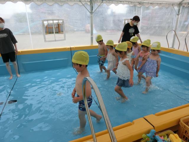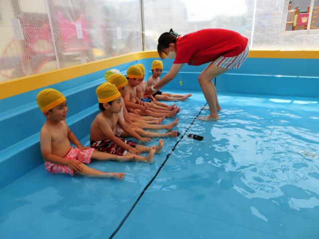 準備運動もしっかりと行い、プールに入ると「冷たーい」「気持ちいい」と嬉しそうにしていました。