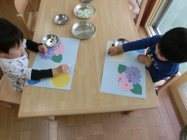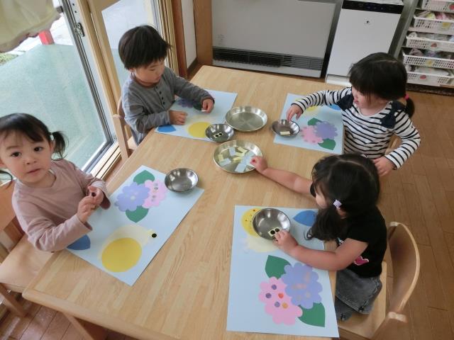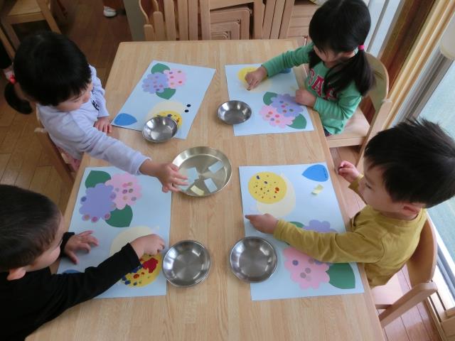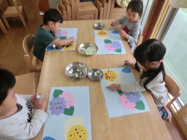 アジサイの花びらをハサミで切ったり、折り紙でカタツムリを折ったり。