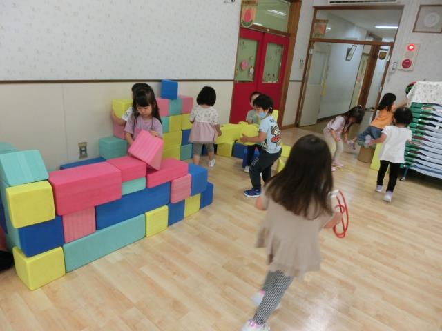 その後、カラー積み木やボール、縄跳び、フラフープなど自由に遊んでいます。