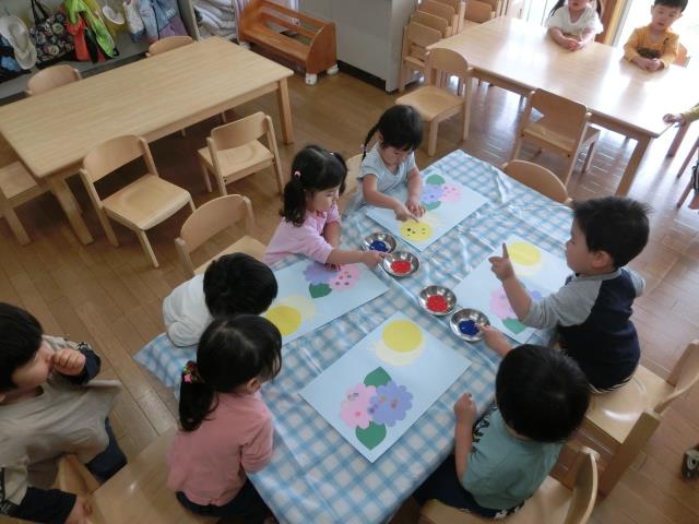 指に絵の具をつけて点描に取り組み、模様を作る工程では、楽しそうに何度も繰り返しトントン描いていましたよ。