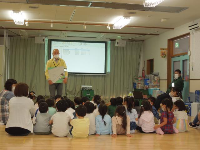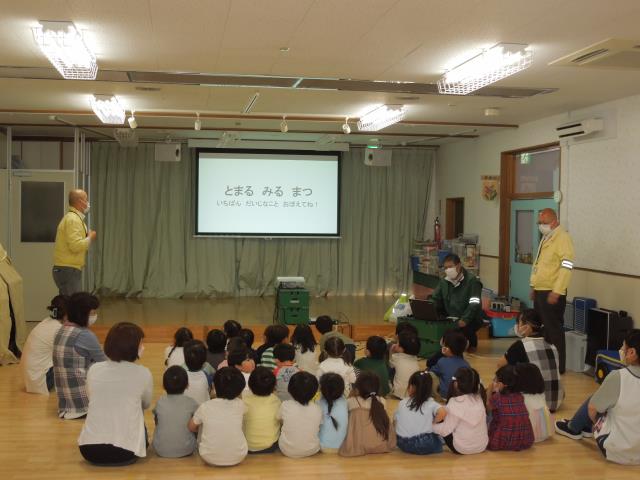 交通指導員の方に来て頂きましたが、コロナ禍ということで、3・4・5歳児のみ参加しています。