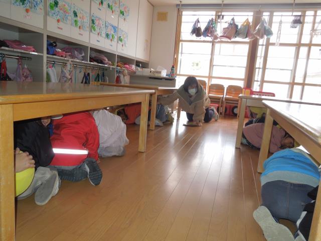 ベルの音が鳴るとすぐにテーブルの下に隠れ、その後、園庭へ避難しました。
