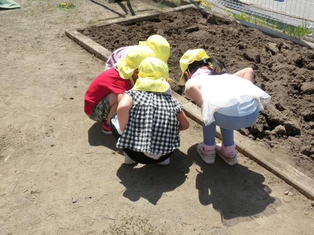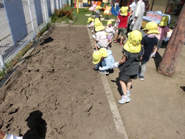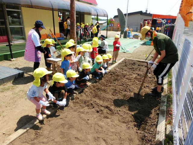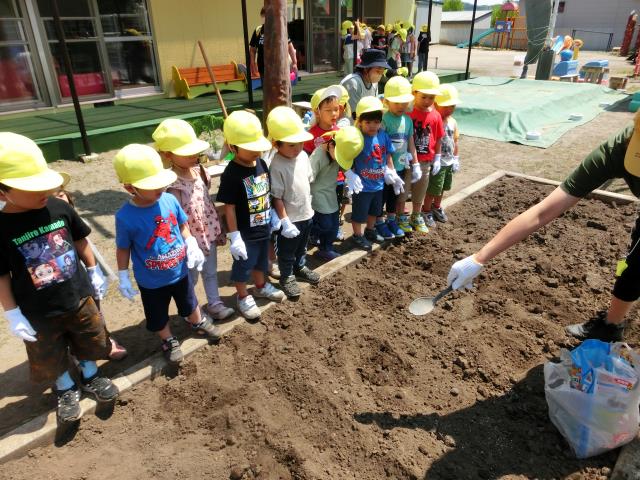先生が畑に肥料を混ぜているのを「すごいね!せんせい!!」と目を輝かせながら見ていた子ども達。