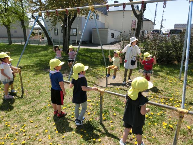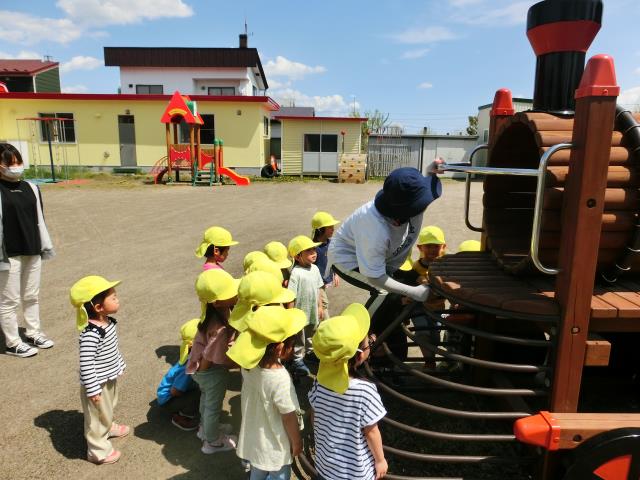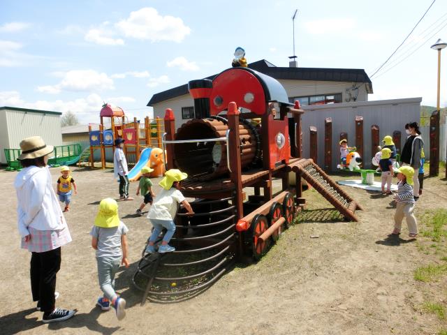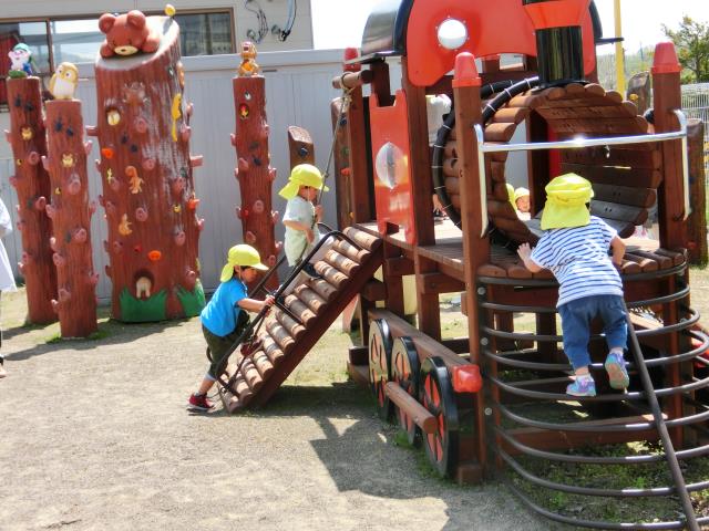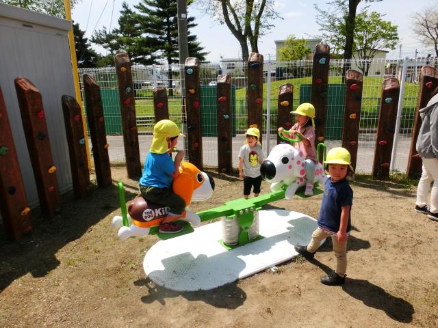 シーソーや汽車などの遊具の遊び方を、みんなで確認してから遊び始めました。