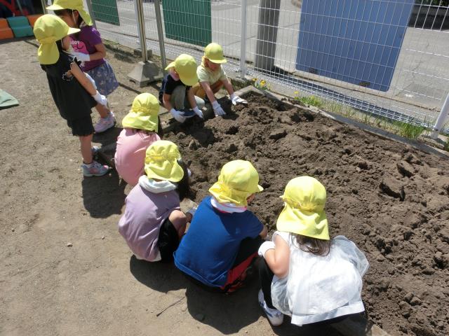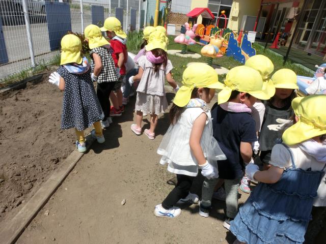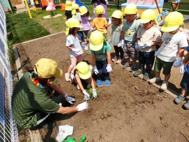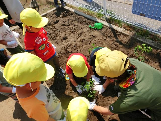 今日のちゅうりっぷぐみは、園庭の畑に以前の話し合いでみんなで決めた、トマトの苗を植えました。