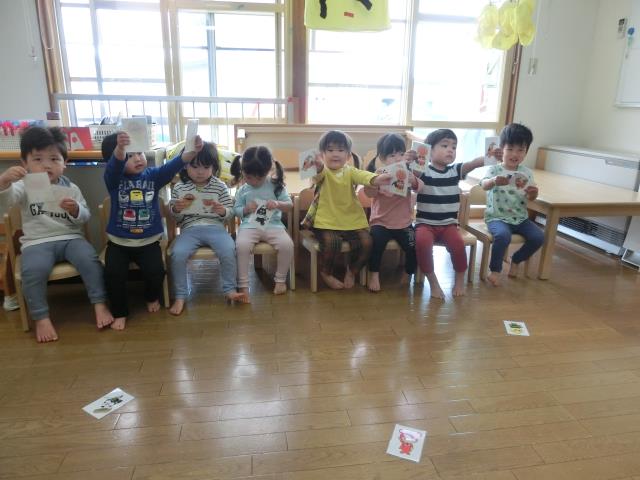 キャラクターの名前のクイズをしてから、先生が出したカードと同じキャラクターを探しました。
