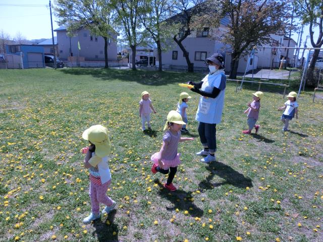 少しだけ遠回りをしてお散歩を楽しんだ後、しゃぼん玉を追いかけたり、芝の上をたくさん走って体を動かして遊ぶことを楽しんできましたよ。