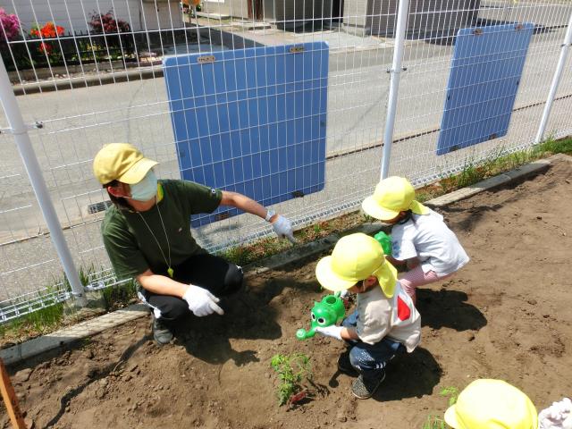 苗に土を被せたり、水をあげたり、「おいしくな~れ」と言いながら楽しんで植えてくれていましたよ!