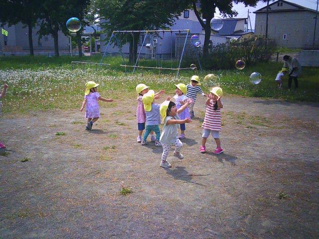 風に乗ってフワフワする、大きなしゃぼん玉や小さなしゃぼん玉を追いかけて、元気いっぱい公園内を走りまわっていた子ども達です。