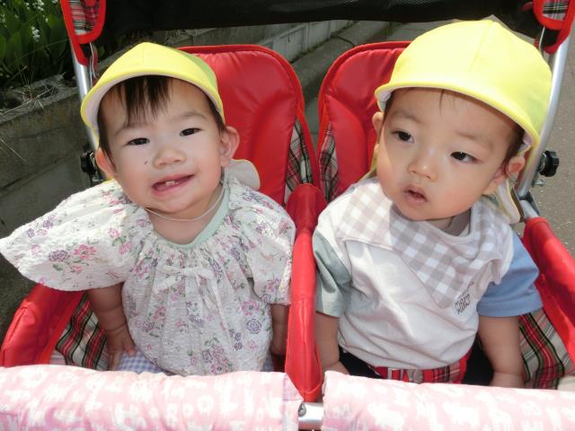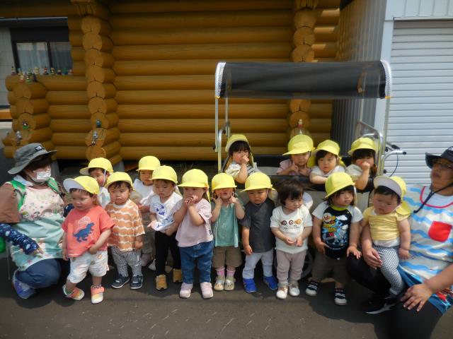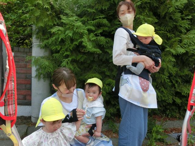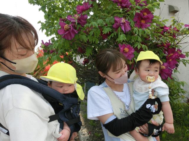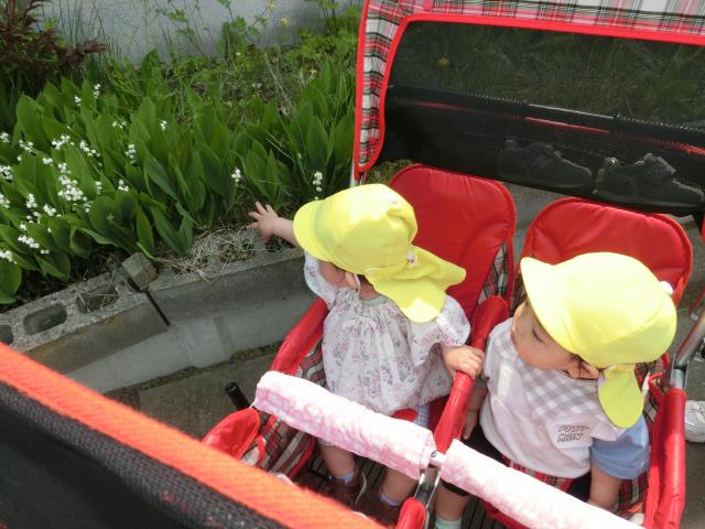靴を履いて歩いたり、ベビーカーや抱っこで行き、芝桜やスズランなど色々なお花を見つけ、近くで見ては指差しをして興味を示す様子がたくさん見られています!
