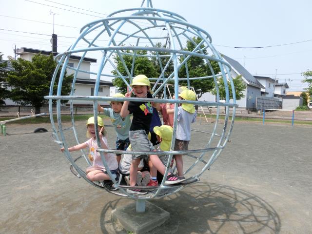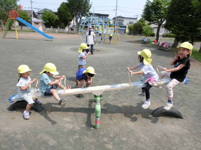 公園では、シーソー・ジャングルグローブ・ジャングルジム・ブランコの遊具で遊んだり、ポックリをして伸び伸びと過ごしています。