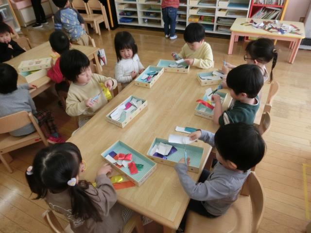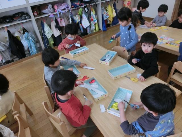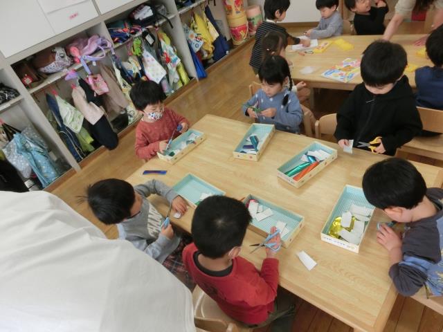 グループ毎にはさみの使い方やお約束を確認し、好きな色の折り紙を選んで切っています。