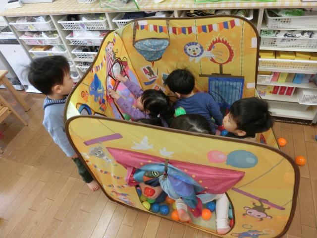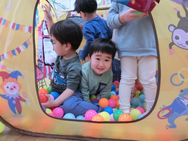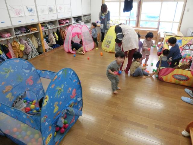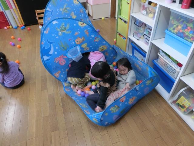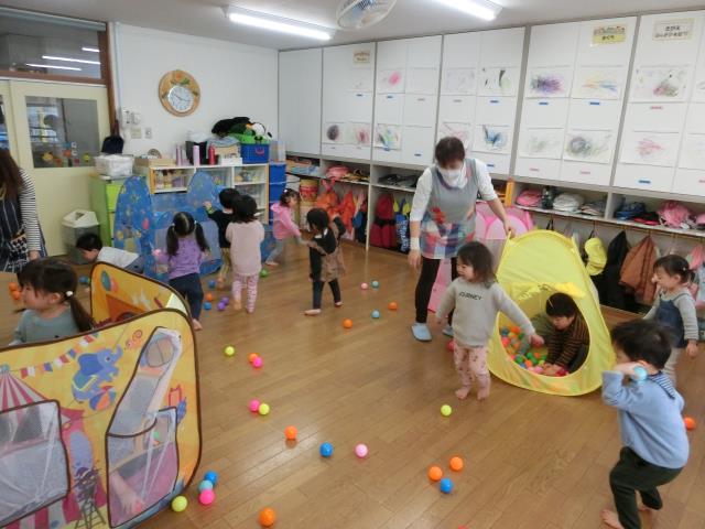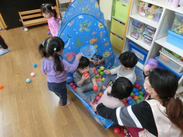 今日のたんぽぽぐみは、お部屋でボールプールを出して遊んでいます。