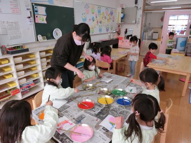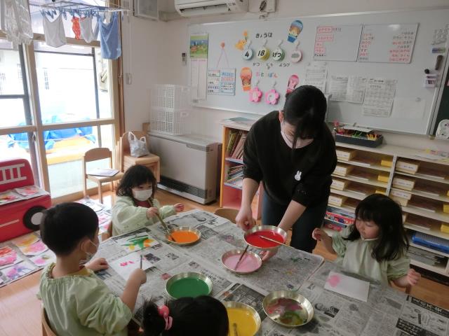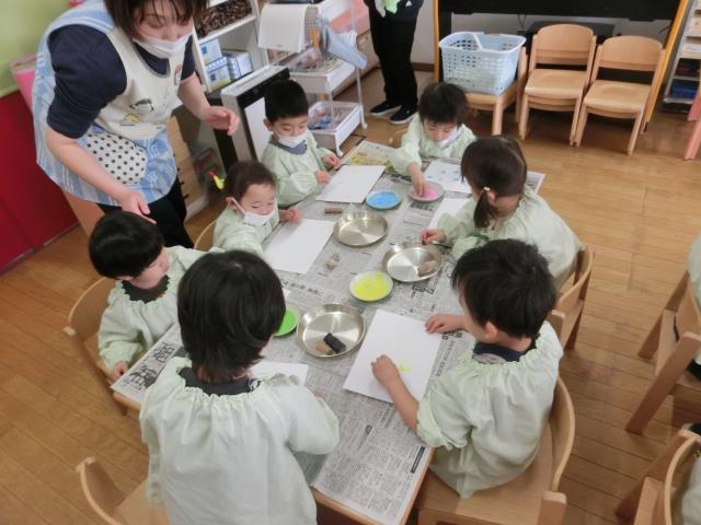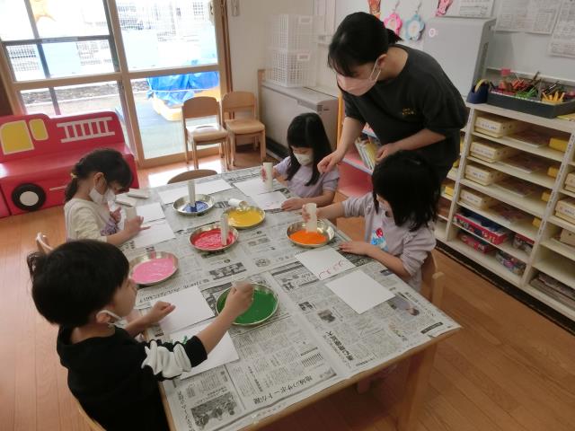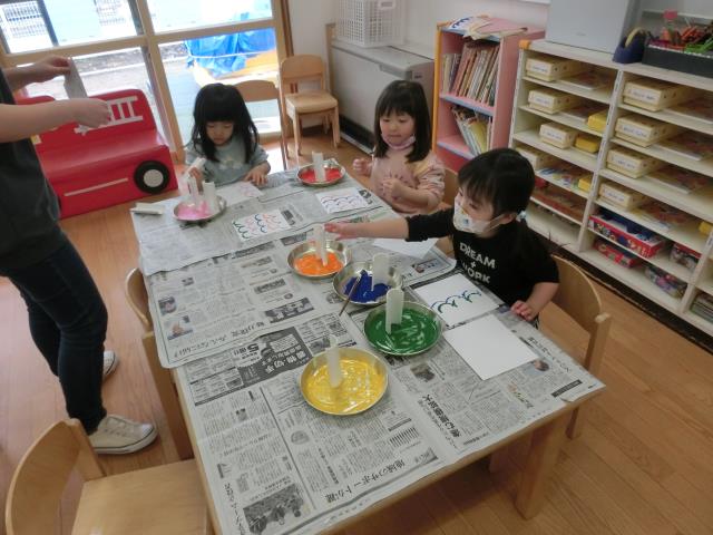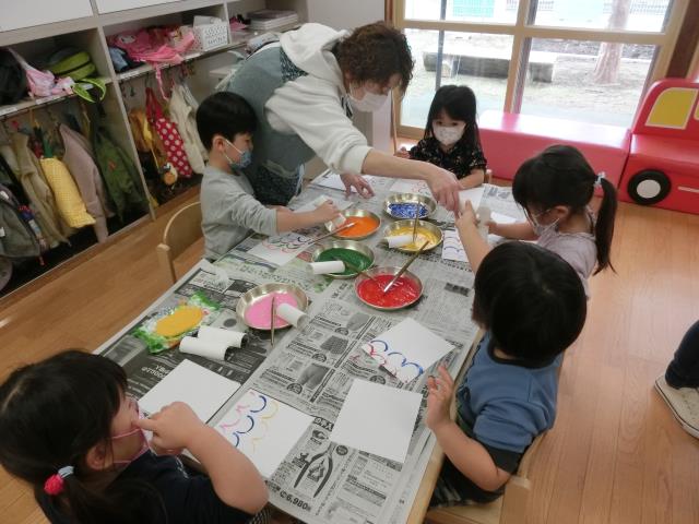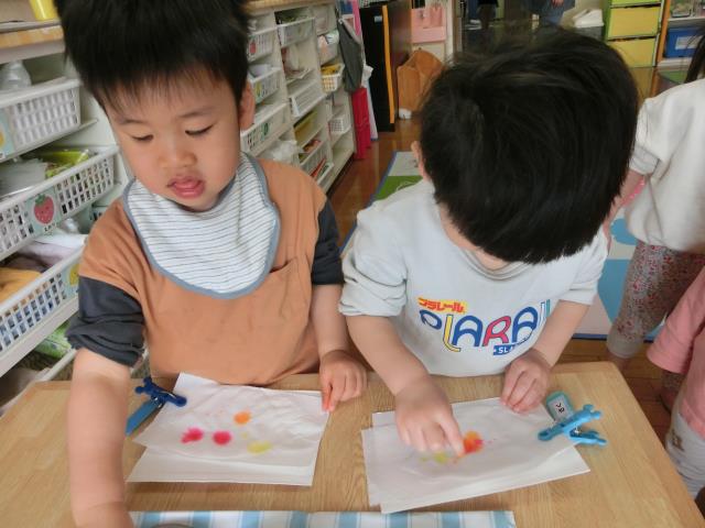 絵の具がじわーっと広がる様子を見て、「すごーい!」「きれーい!」と大興奮の子ども達でした。