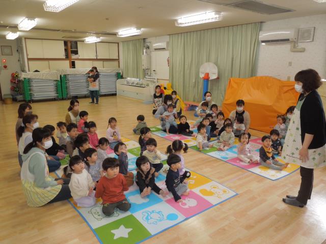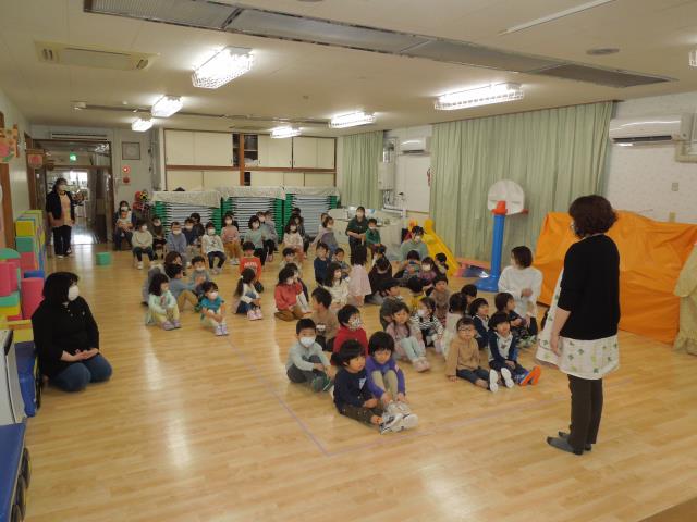 大きいお友だちは『お・は・し・も』のお話もして、お→押さない、は→走らない、し→しゃべらない、も→戻らないの避難の仕方なども学びました。