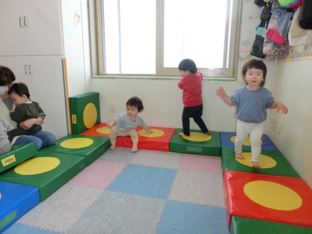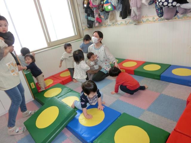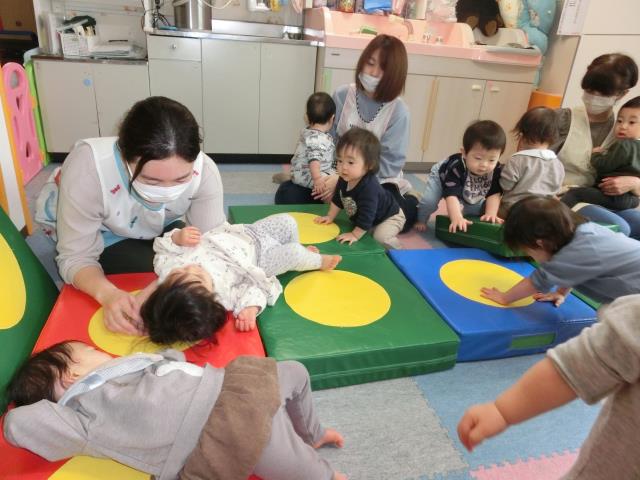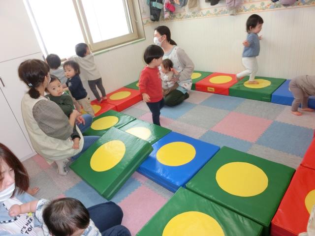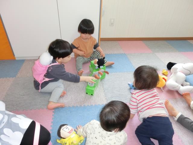 ひよこぐみでは、ぬいぐるみと抱っこ紐でお母さん気分を味わったり、手作りの車にぬいぐるみを乗せたりして楽しみましたよ。