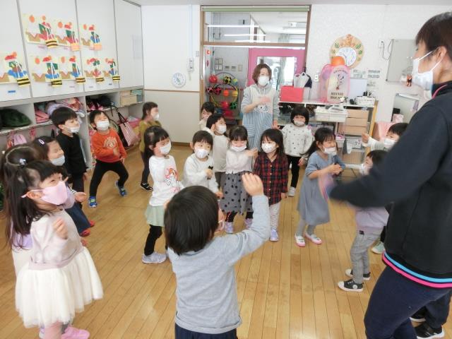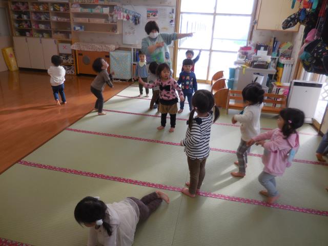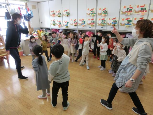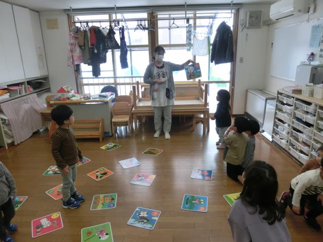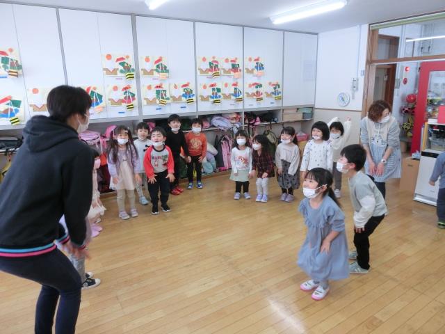 リズムに合わせて体を動かしたり、動物の名前の文字の数と同じ人数になるように、お友だちと集まるゲームで楽しんで参加していましたよ。