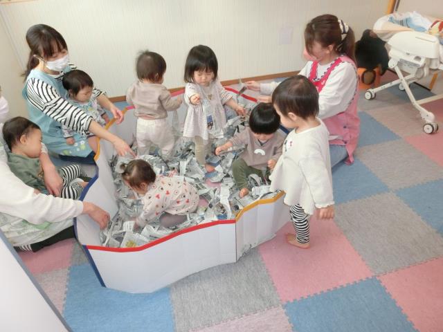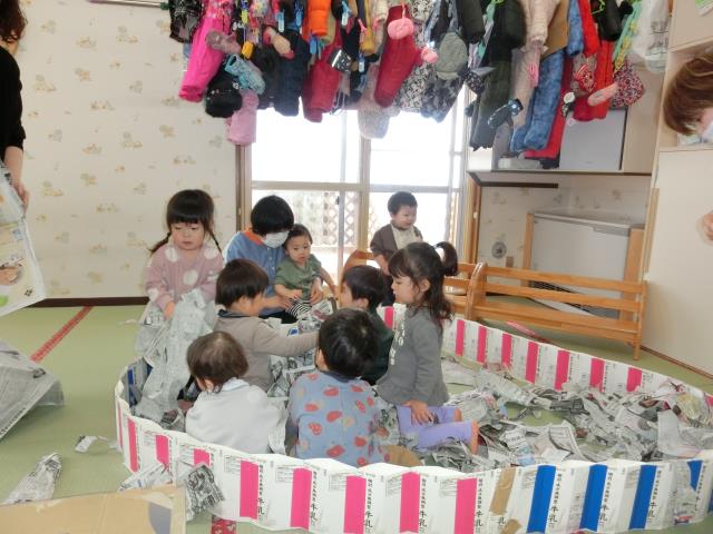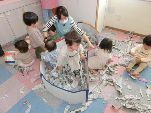 喜んで新聞紙プールに入ったり、新聞紙をビリビリと破いたり、とっても楽しそうでしたよ。