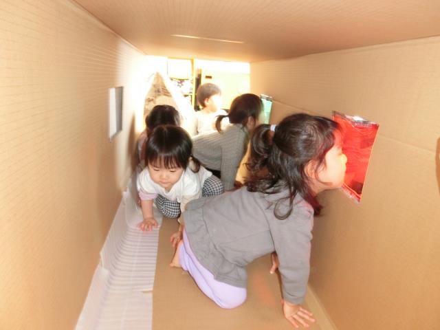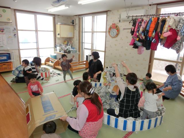 つくしぐみでは、大きな段ボールをトンネルにしてくぐりぬけたり、新聞紙のプールを作って遊びました。