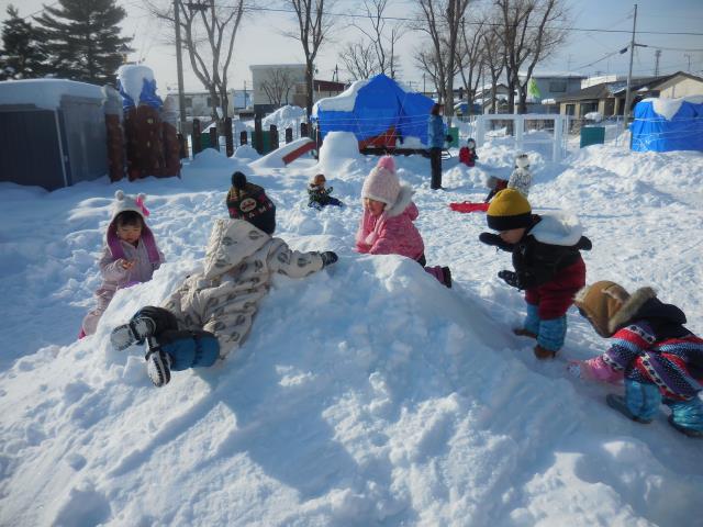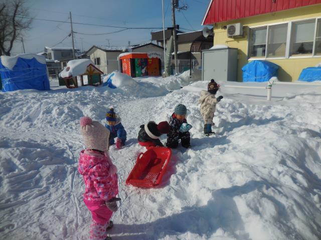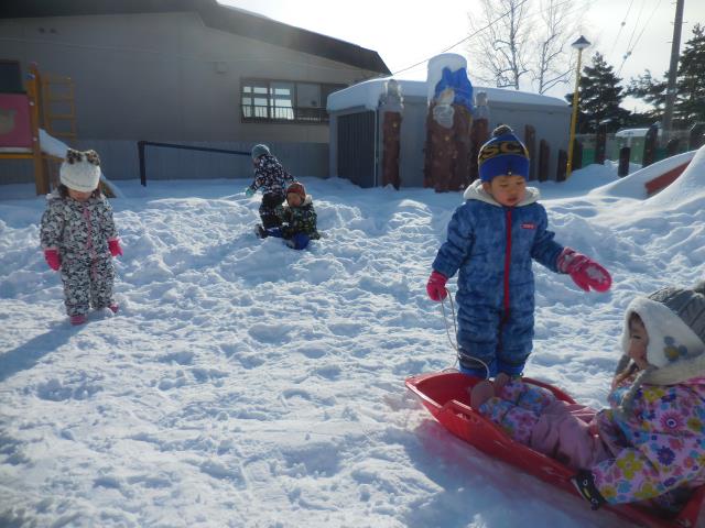 そりに乗ってひっぱってもらって喜んだり、小さな雪山からそり滑りをしたり、雪山登り、追いかけっこ等それぞれたくさん体を動かして遊んでいます。
