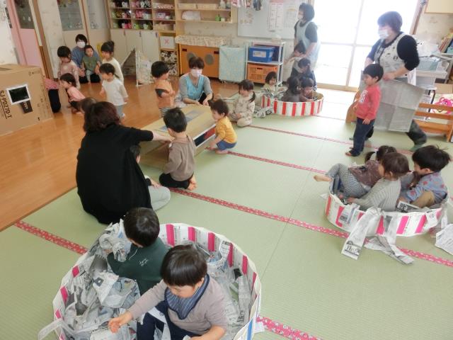 ひよこぐみは、お誕生児がいないため、新聞紙あそびをしました。