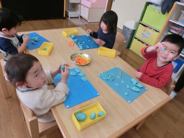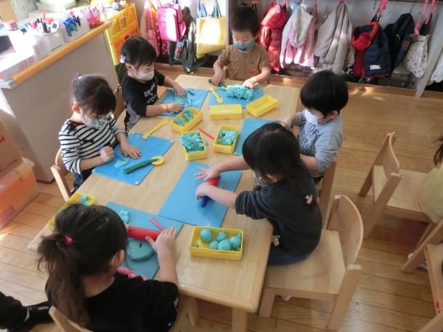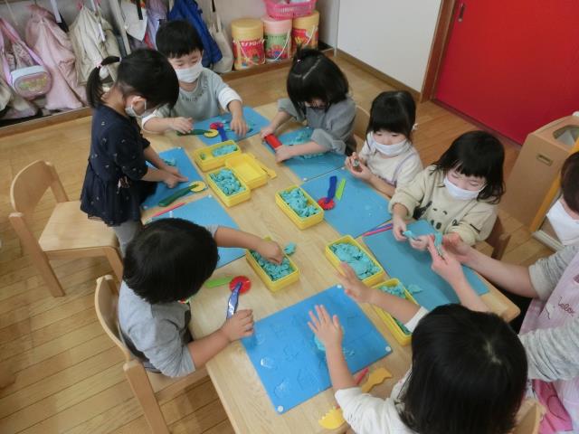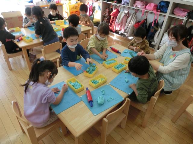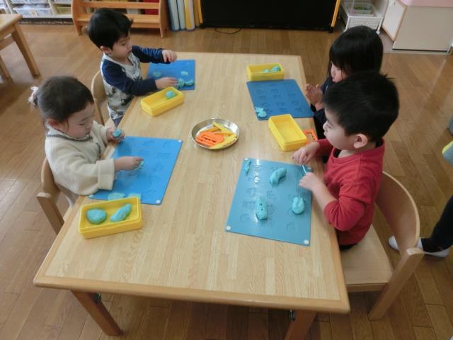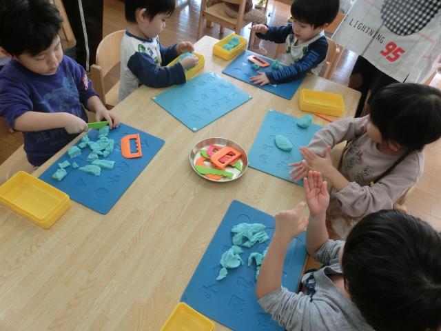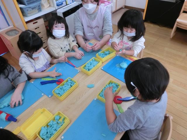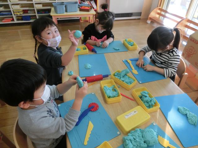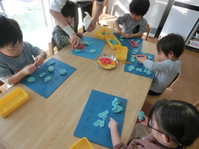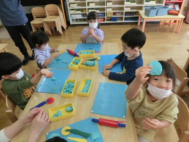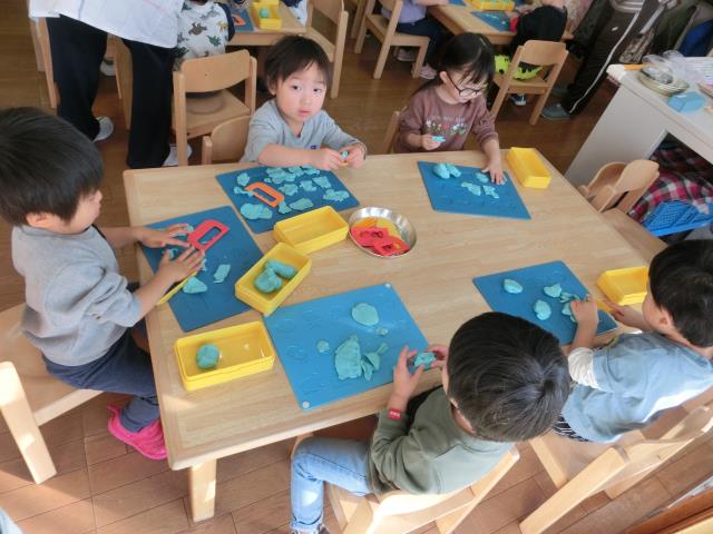 最初は型を抜いて遊んでいる子が多くいましたが、「へび」や「ウィンナー」「フルーツあめ」など、立体の物も上手に作って楽しんでいました!