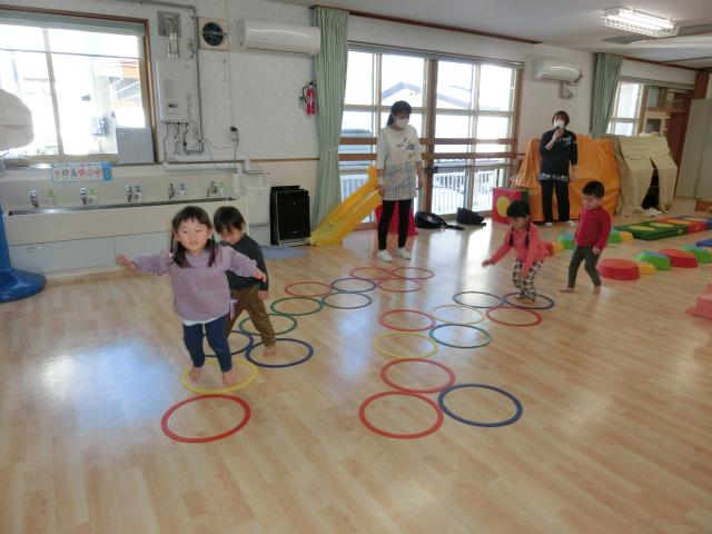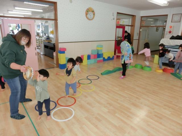 今日のたんぽぽぐみは、ホールで体を動かす遊びを楽しんでいます。