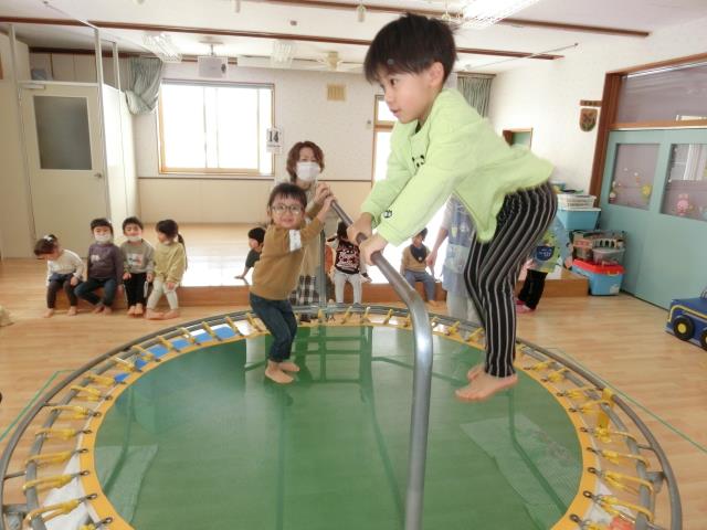 ホールでは、小さいクラスから大人気の「トランポリン」を出し、お友達と一緒に跳んだり、高さを競って楽しんでいましたよ。