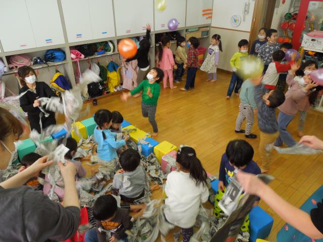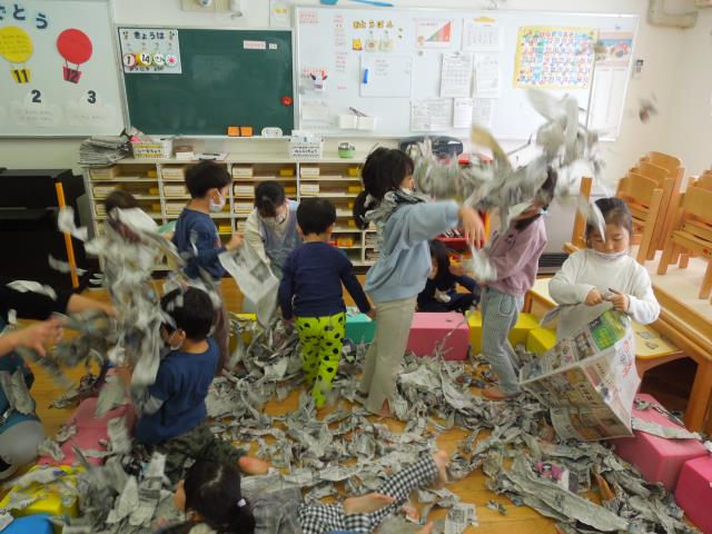 新聞紙をちぎったり、シャワ―のように掛け合ったり、お風呂のようにつかったりと、体全身で楽しんでいましたよ。