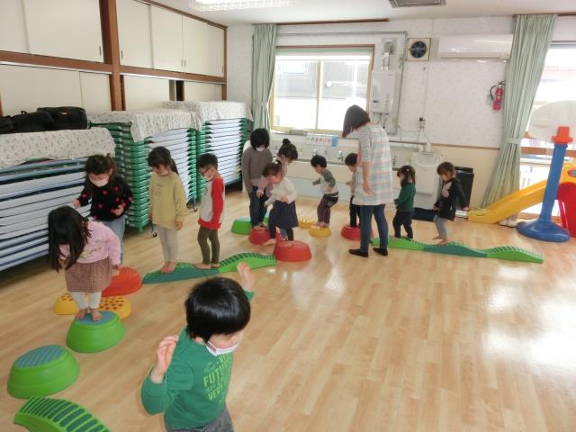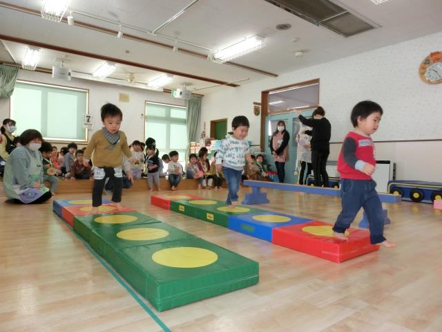 体を沢山動かして遊べるように「サーキット」も作り、バランスを上手くとりながら、小さい子もチャレンジをし、上手に歩いていました。